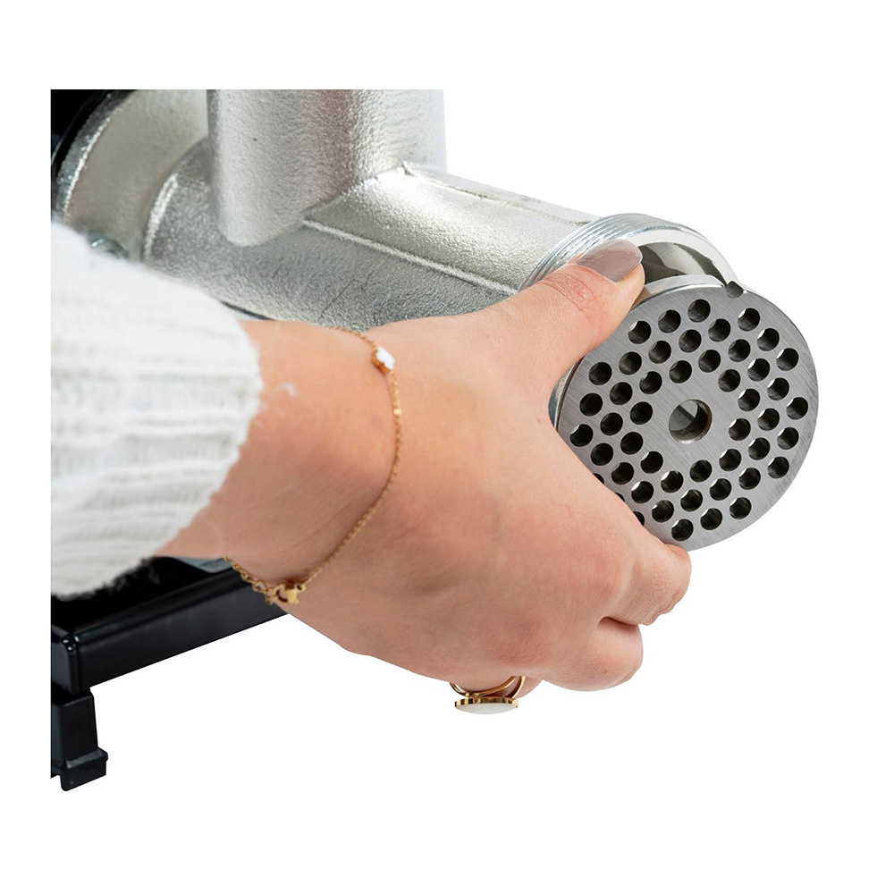 The motor has a power of 400W, and the mincer can produce 30-50kg of minced meat per hour. Mincer dimensions: 35*17*26,5cm for 9kg. Grid hole: 6mm.