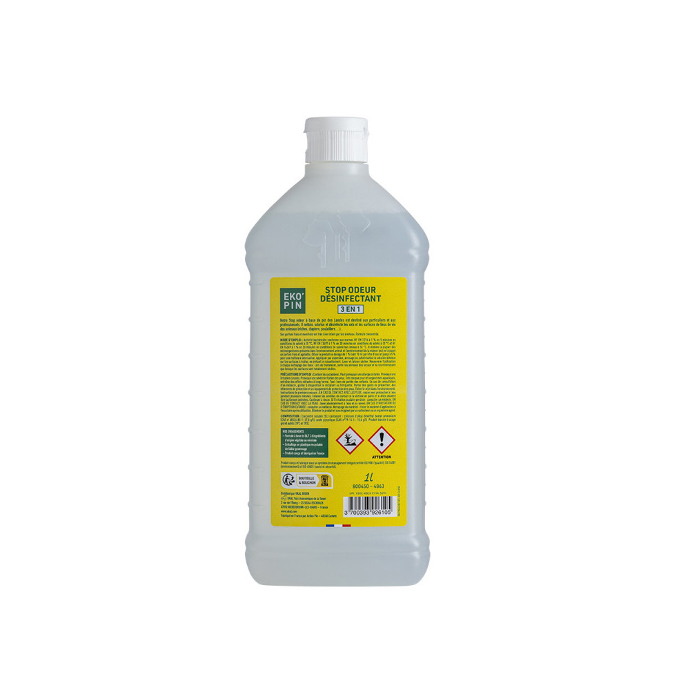 Assainir votre intérieur n'a jamais été si facile. Le désinfectant stop odeurs 3 en 1 EKO'PIN nettoie, désodorise et désinfecte les espaces de vie de vos animaux (poulaillers, niches, clapiers, etc.) ainsi que les caves et les garages. Son parfum à base de Pins des Landes, rigoureusement sélectionnés pour leurs propriétés hygiéniques et odorisantes, est très bien toléré par les animaux.