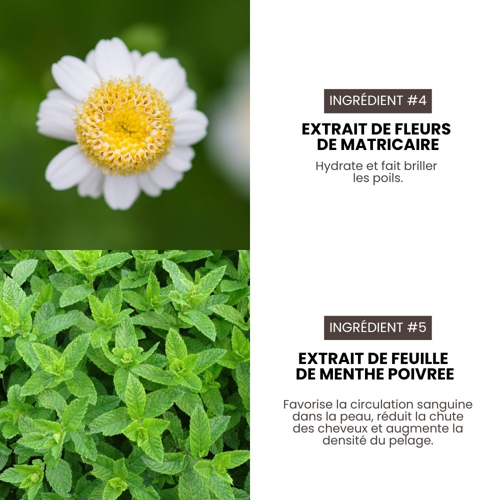 L'extrait de fleur de matricaire hydrate et fait briller le pelage. L'extrait de feuille de menthe poivrée favorise la circulation sanguine dans la peau, réduit la chute des poils et augmente la profondeur des follicules, ce qui renforce les mèches.
