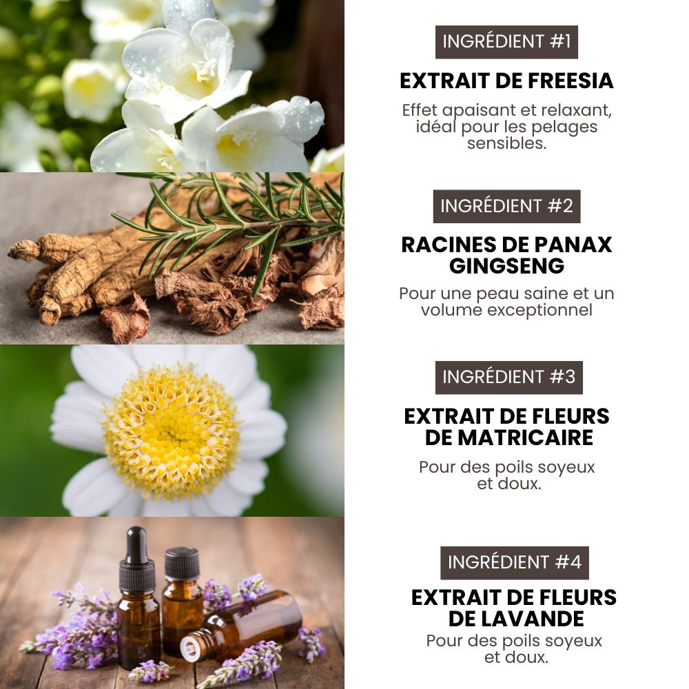 Deze natuurlijke, hypoallergene shampoo voor volume reinigt en hydrateert tot diep in de vacht, met respect voor specifieke vachten zoals poedels en bichons. Hij geeft vorm en volume aan gekrulde of golvende vachten.