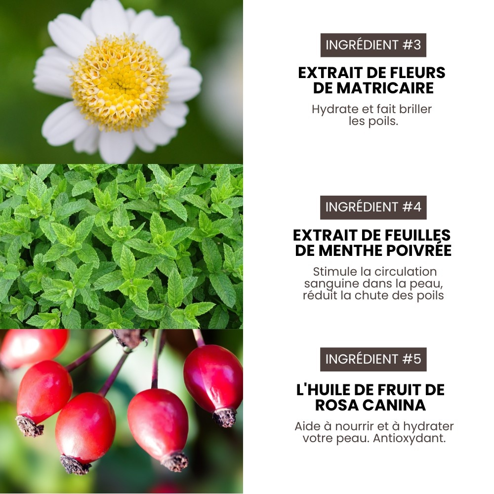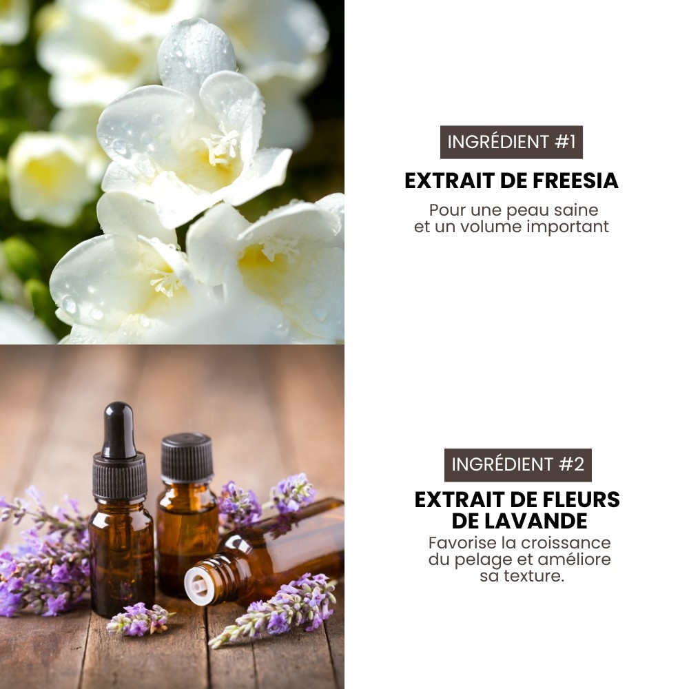 Lavendelbloemextract versterkt de haarzakjes en stimuleert de haargroei. Regelmatig gebruik van lavendelolie verbetert de vachttextuur door de haarzakjes te conditioneren, pluis te verminderen en haaruitval te beperken. Matricariabloemextract hydrateert en geeft glans aan de vacht. Pepermuntbladextract stimuleert de bloedsomloop in de huid, vermindert haaruitval en vergroot de diepte van de follikels.